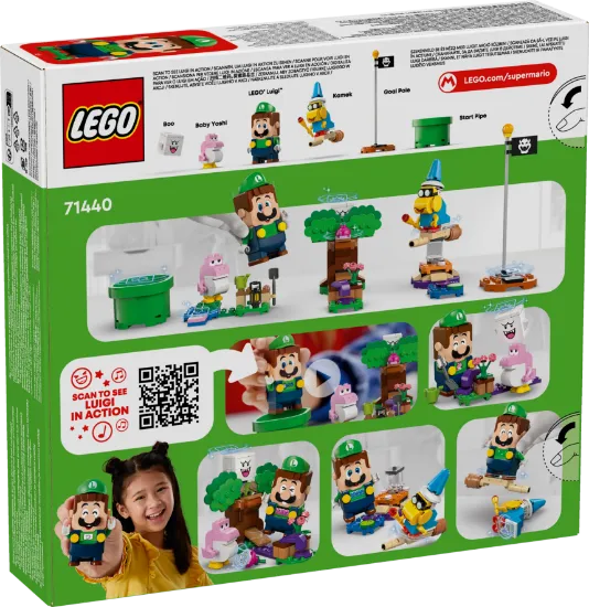 "Enjoy fun garden-exploring adventures with interactive LEGO Luigi in this LEGO Super Mario toy playset for kids (71440). An awesome Nintendo gift for boys, girls and gamers aged 6 and over, the set features an interactive LEGO Luigi figure, plus Kamek, a Pink Baby Yoshi and a Boo. Travel from the Start Pipe to the Goal Pole via 3 garden builds, triggering digital reactions from LEGO Luigi and collecting coins along the way. Greet the Pink Baby Yoshi and grab some tools. Defeat the Boo hiding in the tree and ‘eat’ the fruit. Stomp on the Mushroom Platform to topple Kamek and fly away on Kamek’s broomstick.